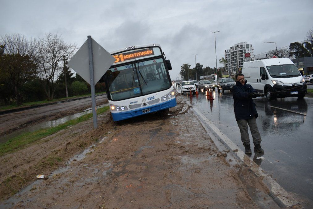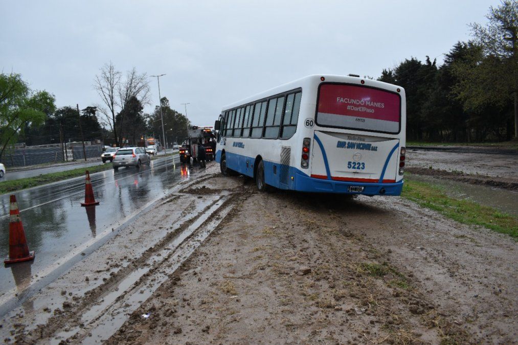 A las 16:20 un pasajero le solicitó al chofer que lo dejara a unos metros de la parada de colectivo para evitar mojarse. El colectivero, que no acostumbra hacer esta ruta y desconocía el estado de la banquina, accedió al pedido del pasajero. Una vez que estacionó, no pudo volver a salir. Todos los pasajeros tuvieron que esperar a que llegue una nueva unidad para poder irse.