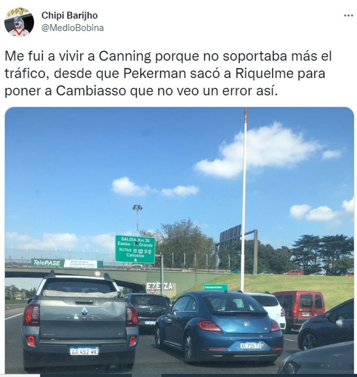 Con una metáfora futbolera, un usuario de Twitter resumió la desilusión que sufren los vecinos recién llegados a Canning a partir de las complicaciones que genera el tránsito intenso en la ciudad y sus accesos. “Me fui a vivir a Canning porque no soportaba más el tráfico. Desde que (el ex DT de la Selección Argentina José) Pekerman sacó a Riquelme para poner a Cambiasso (en el Mundial de Alemania 2006) que no veo un error así”, posteó la cuenta “Chipi Barihjo”, que tiene más de 50 mil seguidores. El texto estaba acompañado por la foto de un embotellamiento en el “rulo” desde el que se pasa de la Autopista Riccheri a la autopista Ezeiza – Cañuelas.
