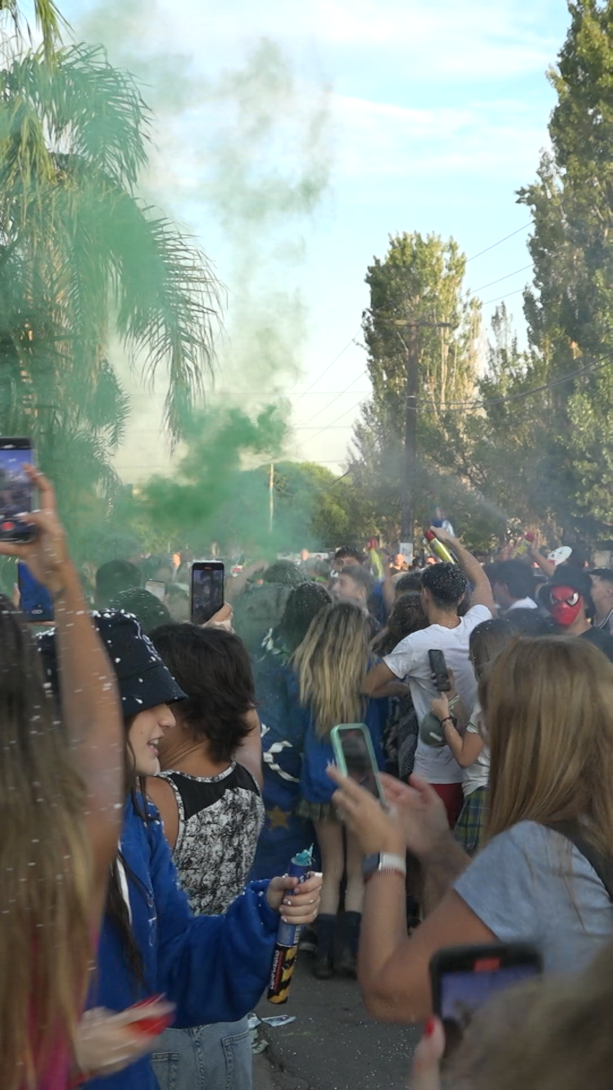 Los estudiantes más grandes de la institución escolar de Canning llegaron unidos en un micro, con redoblantes, bengalas de humo, nieve artificial y cantos para celebrar el inicio del último año lectivo. "Apoyo los festejos, pero no me gustan que tomen alcohol. Este es un ambiente sano y todos fuimos pibes", señaló Claudio, padre de Gianluca, que también celebró su UPD.