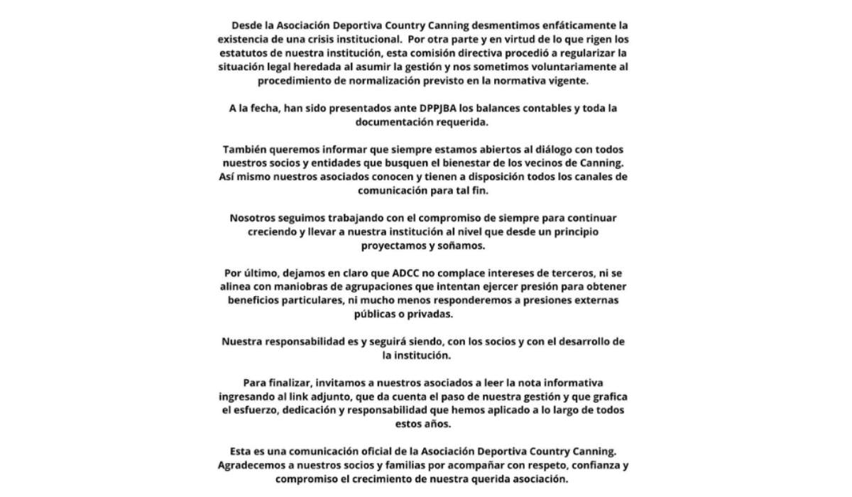 La Asociación Deportiva Country Canning (ADCC) publicó en las últimas horas un comunicado oficial en el que negó “enfáticamente la existencia de una crisis institucional”. “En virtud de lo que rigen los estatutos de nuestra institución, esta comisión directiva procedió a regularizar la situación legal heredada al asumir la gestión y nos sometimos voluntariamente al procedimiento de normalización previsto en la normativa vigente”, señalaron.