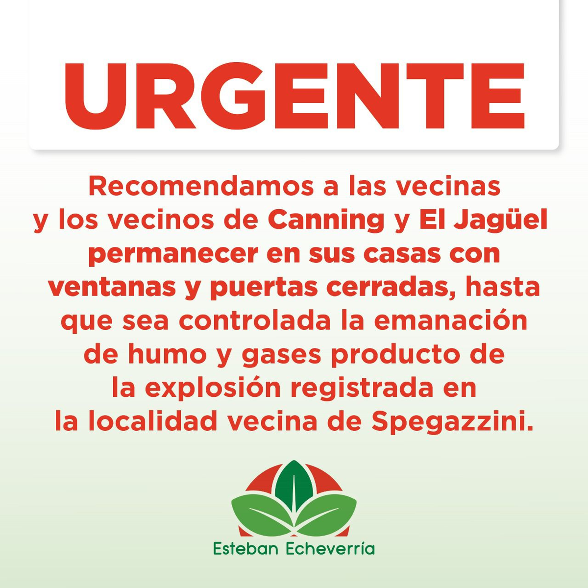 Tras la explosión registrada en la fábrica del polo industrial de Canning, ubicada detrás de la fábrica Sinteplast y del otro lado de la autopista Ezeiza-Cañuelas, se generó una densa nube de humo que avanza hacia zonas cercanas. Por este motivo, se recomendó a los vecinos de Canning, Ezeiza y áreas linderas tomar precauciones hasta que la situación se normalice, ya que el humo sería tóxico.
