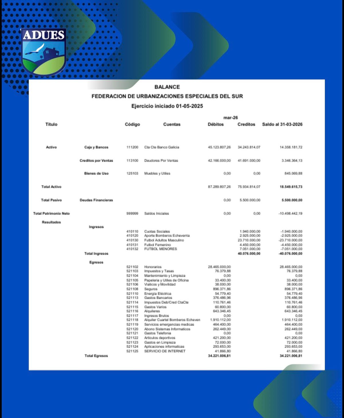 En cuanto al estado financiero, el saldo final de “Deudores por Ventas” se situó en $3.346.364,13. El activo total de la institución ascendió a $18.549.615,73, respaldado principalmente por una cuenta corriente en el Banco Galicia con un saldo de $14.358.181,72. Desde la conducción de ADUES enfatizaron que el envío de esta documentación (estados contables, listado de asociados y detalle de honorarios) responde a un compromiso con la transparencia institucional.