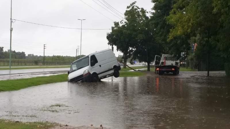 Tres trabajadores vivieron una mañana complicada a causa de la tormenta, dado que la camioneta en la que viajaban terminó encajada en el fondo de una zanja. A pesar de intentar salir por sus propios medios, el frente de la misma se hundió y debieron solicitar la asistencia de una grúa.