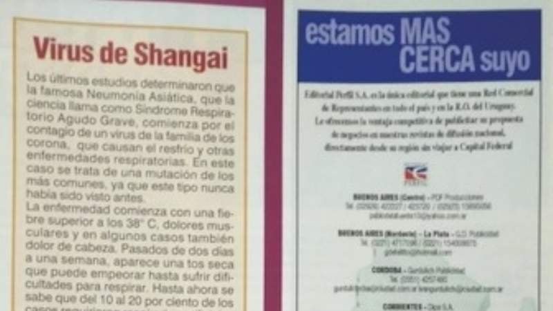 Un viejo amigo me envió el siguiente artículo publicado en el año 2003: "Los últimos estudios determinaron que la famosa Neumonía Asiática comienza por el contagio de un virus de la familia de los corona". Diecisiete años después de este artículo de la Dra. Vázquez seguiré con la misma prudencia.