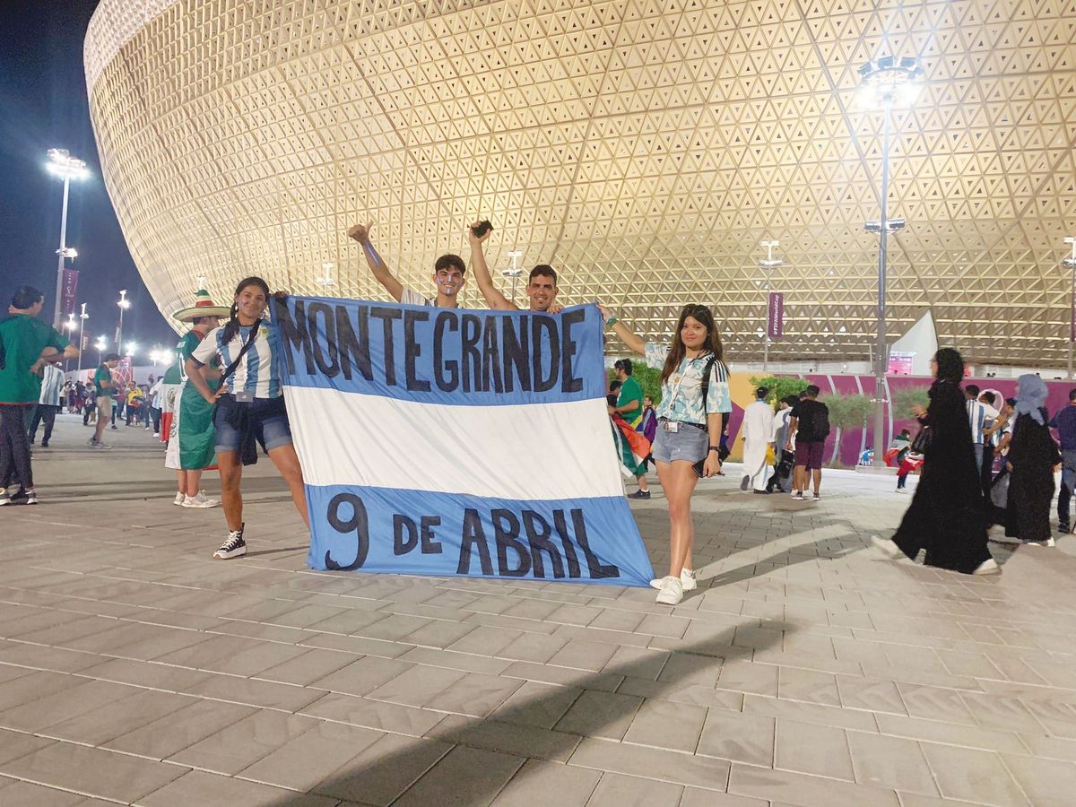Lucas Cinto es un vecino de Monte Grande que hoy vive en España pero que decidió llevar el nombre de la localidad donde nació y vivió hasta hace tres años al Mundial de Qatar. Por eso, viajó junto a su familia a ver a la Scaloneta con una bandera argentina que decía “Monte Grande - 9 de Abril”.