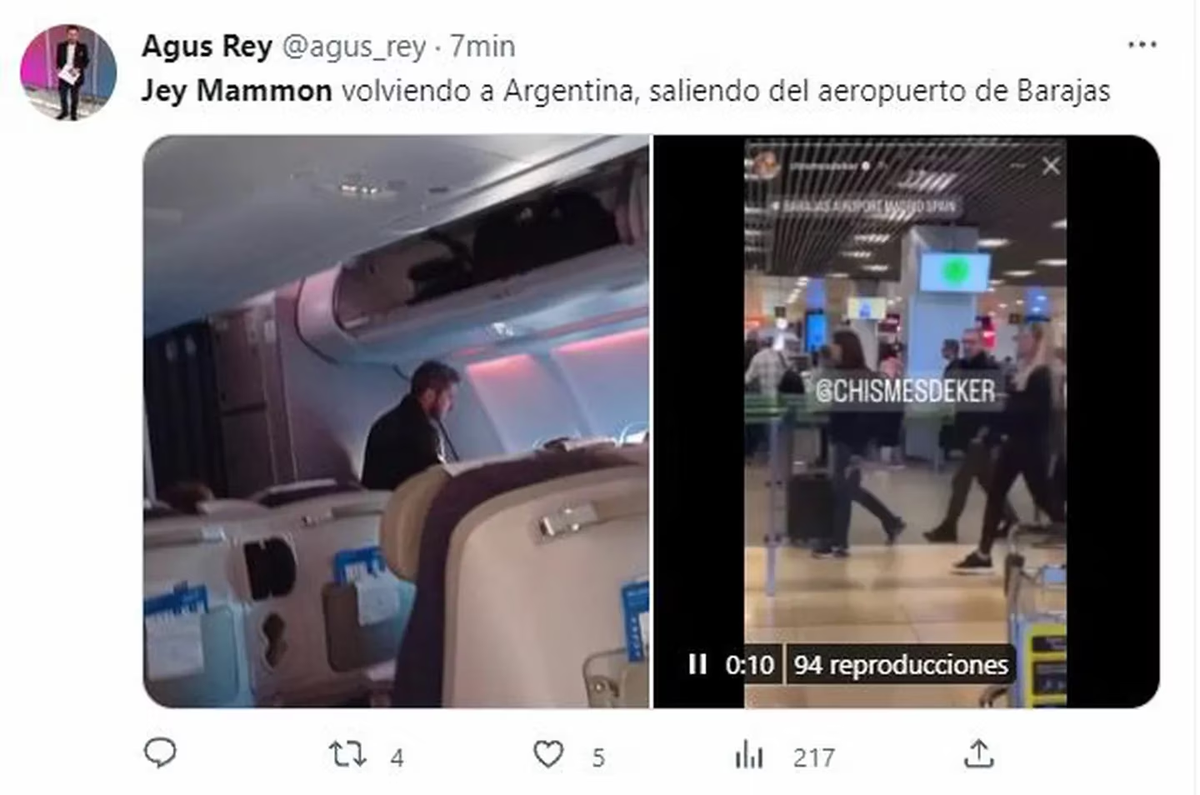 Por su parte, en su perfil de Twitter el periodista Agustín Rey compartió una foto del conductor en el avión. “Jey Mammon volviendo a Argentina, saliendo del aeropuerto de Barajas”, detalló.