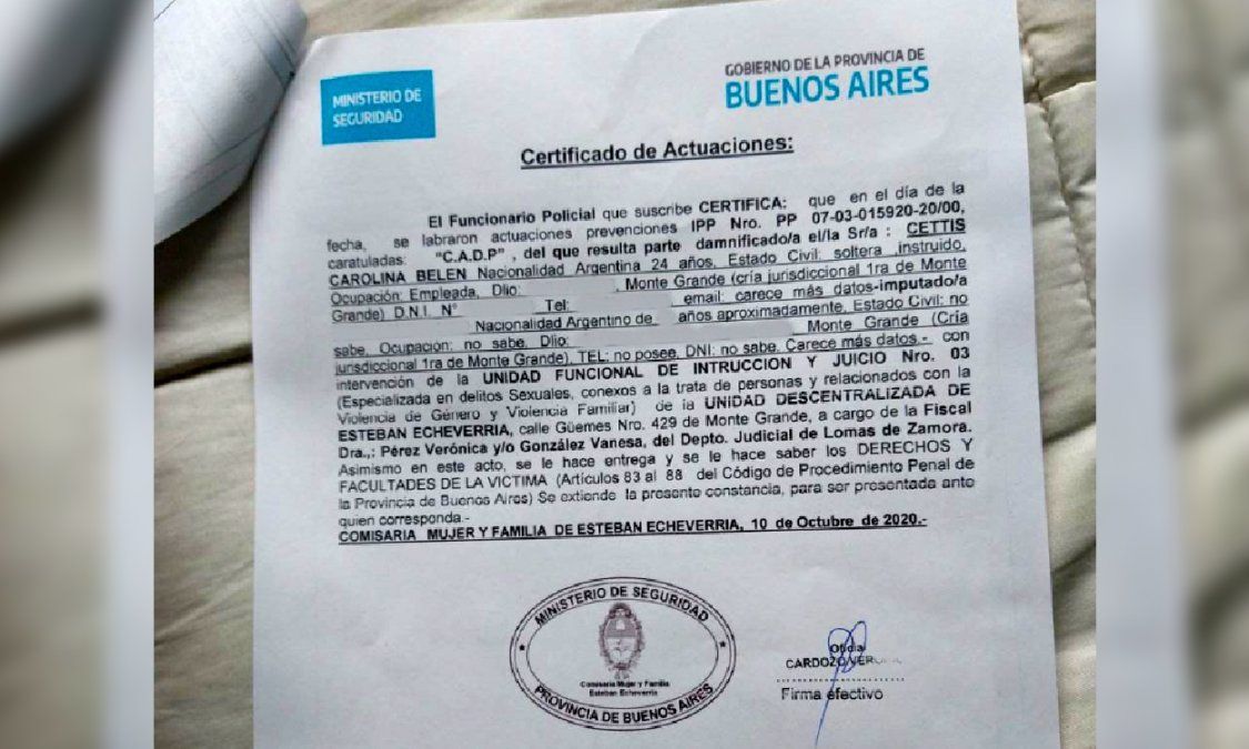 El denunciado está en libertad y bajo investigación de las autoridades. Mientras tanto, Carolina espera que desde el Polo Judicial de Esteban Echeverría confirmen la orden de restricción que solicitó ya hace algunos días. "No sé hasta qué punto puede llegar esta persona", concluyó.
