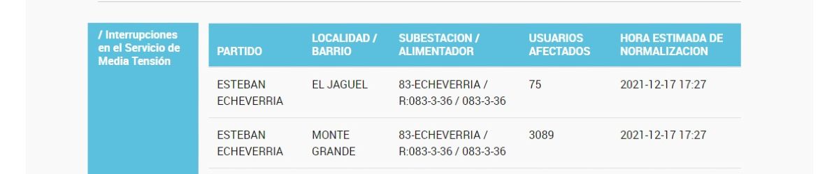 Este mediodía se produjo un importante apagón de luz en varios barrios de Monte Grande y El Jagüel en el que se ven más de tres mil personas afectadas, la mayoría de ellas de la localidad cabecera del partido de Esteban Echeverría: son 3.089 usuarios que corresponden a Monte Grande y 75 en El Jagüel.