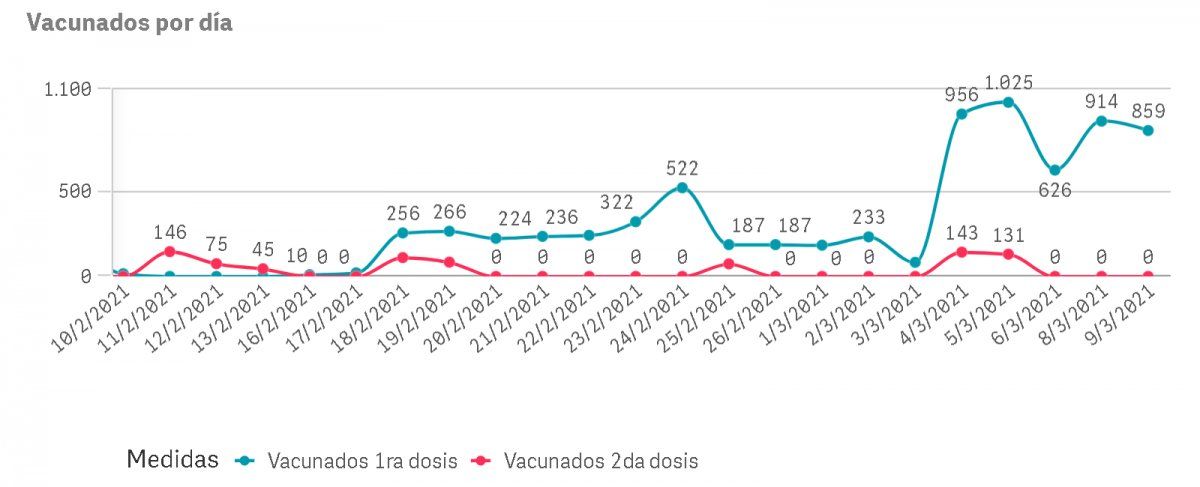De acuerdo a los datos oficiales de la Provincia, que están disponibles en la Sala de Situación del Ministerio de Salud bonaerense, 9.506 vecinos recibieron la primera dosis, y de estos 2.084 ya fueron vacunados con la segunda. Desde el pasado jueves, con la llegada de nuevos lotes de vacunas, el ritmo de inmunización creció considerablemente, tal como se puede ver a continuación en el gráfico.