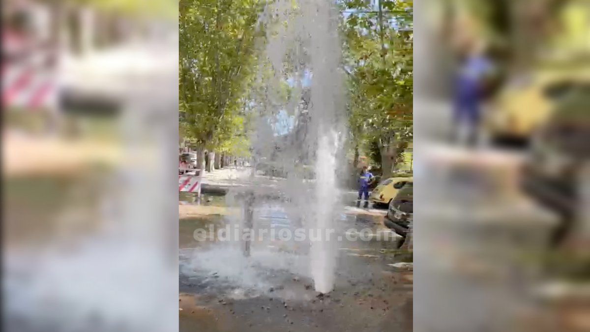Ocurrió apenas pasado el mediodía, en la esquina de Las Heras y Arana. El caño se rompió y la presión expulsó el agua hacia arriba. Trabaja Aysa.