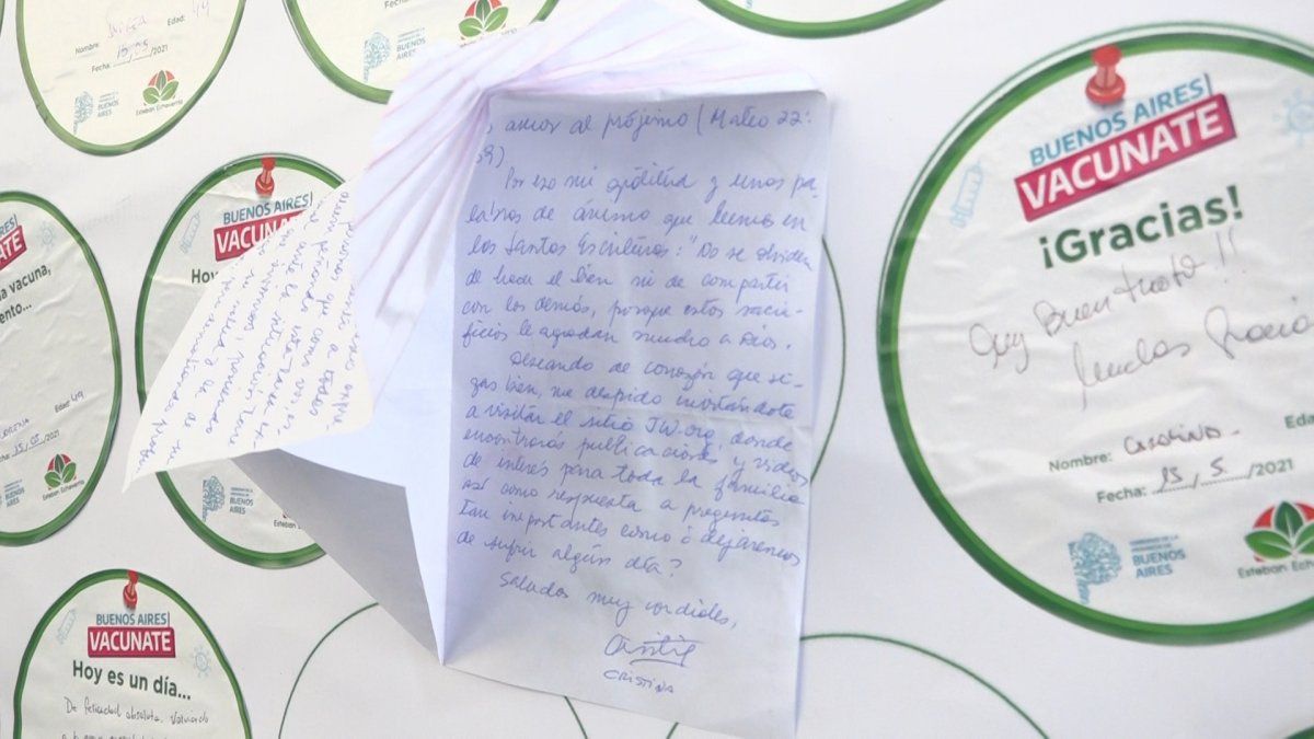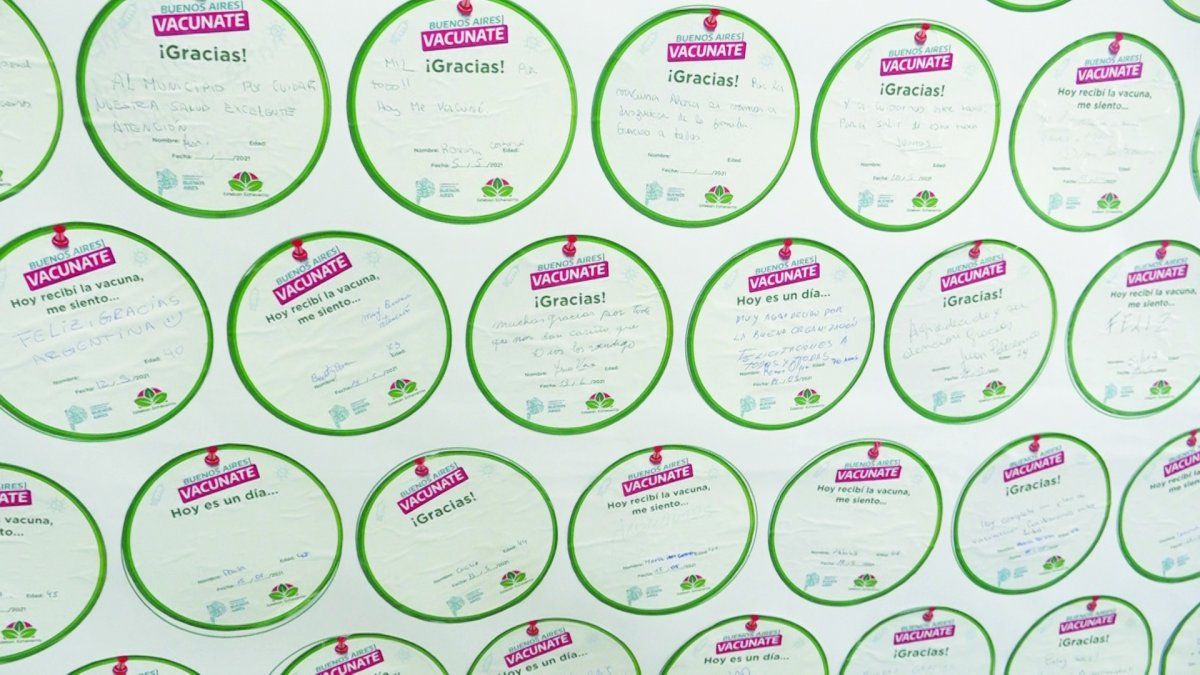El personal del vacunatorio le entrega a los vacunados una pegatina circular, en la que pueden escribir un mensaje y luego dejarlo plasmado en una de las paredes de la carpa, donde hay cientos de etiquetas con agradecimientos y buenos augurios para el futuro. Más de la mitad de los rótulos tienen dedicatorias a profesionales de la salud. Y no es para menos.