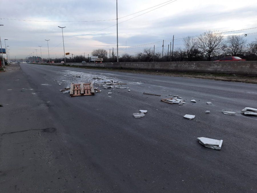 Un camión que transportaba varios elementos de sanitarios perdió un pallet con inodoros sobre Camino de Cintura.