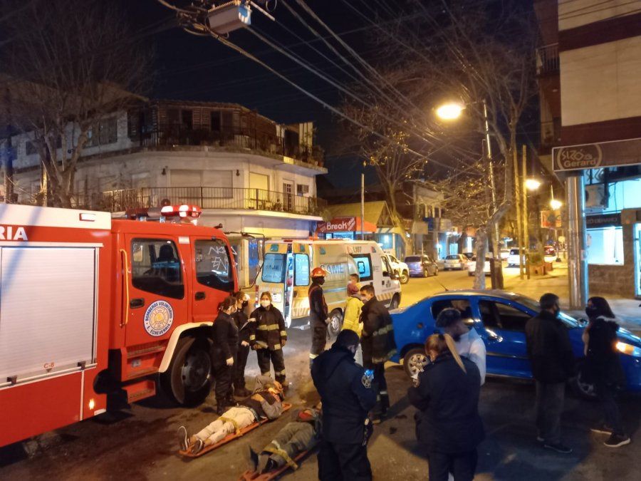 Hasta esta esquina muy transitada del distrito acudió una dotación de bomberos y llevó adelante las tareas de asistencia a los sujetos heridos por el accidente. Luego, fueron trasladados por el personal del SAME al Policlínico Santamarina.