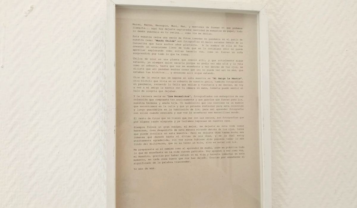 En la muestra pueden encontrarse distintas series de fotos que fueron tomadas por Marcelo. Una de ellas se llama “Mundo chilca” y fue tomada durante la pandemia en el patio de su casa. “Chilca de olor es una planta que creció allí, y que actualmente sigue estando. Yo siempre quise sacarla porque no podía ver más allá y la veía como un arbusto, hasta que vos me enseñaste a ver detrás de sus ojos, me dijiste que ahí pasaban muchas cosas que uno no puede ver así nomás”, relató Florencia en una carta que le escribió a Marcelo y es una presentación de la exposición.