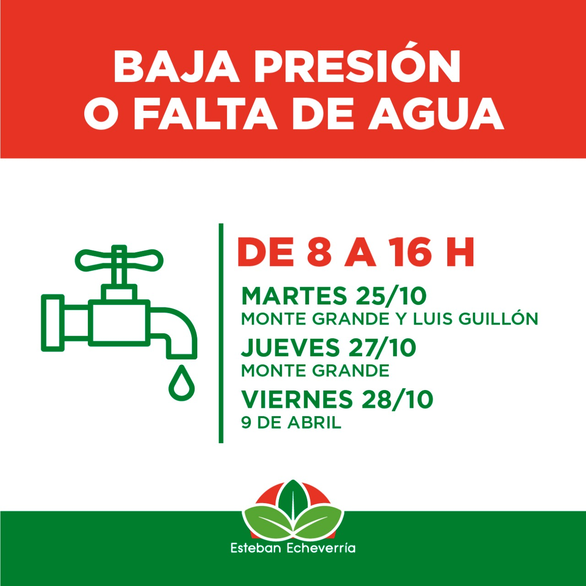 Según informaron el Municipio de Esteban Echeveverría y Agua y Saneamientos Argentinos (AySA), algunas zonas del distrito pueden verse afectadas por baja presión o falta de suministro de agua potable debido a los trabajos de mantenimiento de la red.