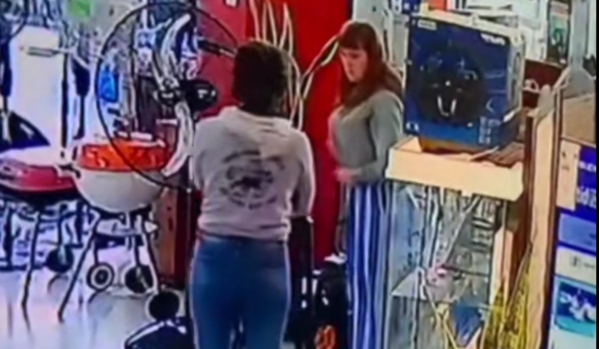 Allí se puede ver como las dos jóvenes miran los productos en exhibición hasta que en un momento una de ellas se pone una caja con un producto debajo del buzo y sale hasta la puerta del local con su compañera. En ese momento la sorprende el encargado del comercio que le saca la caja y echa del lugar a las dos mujeres.