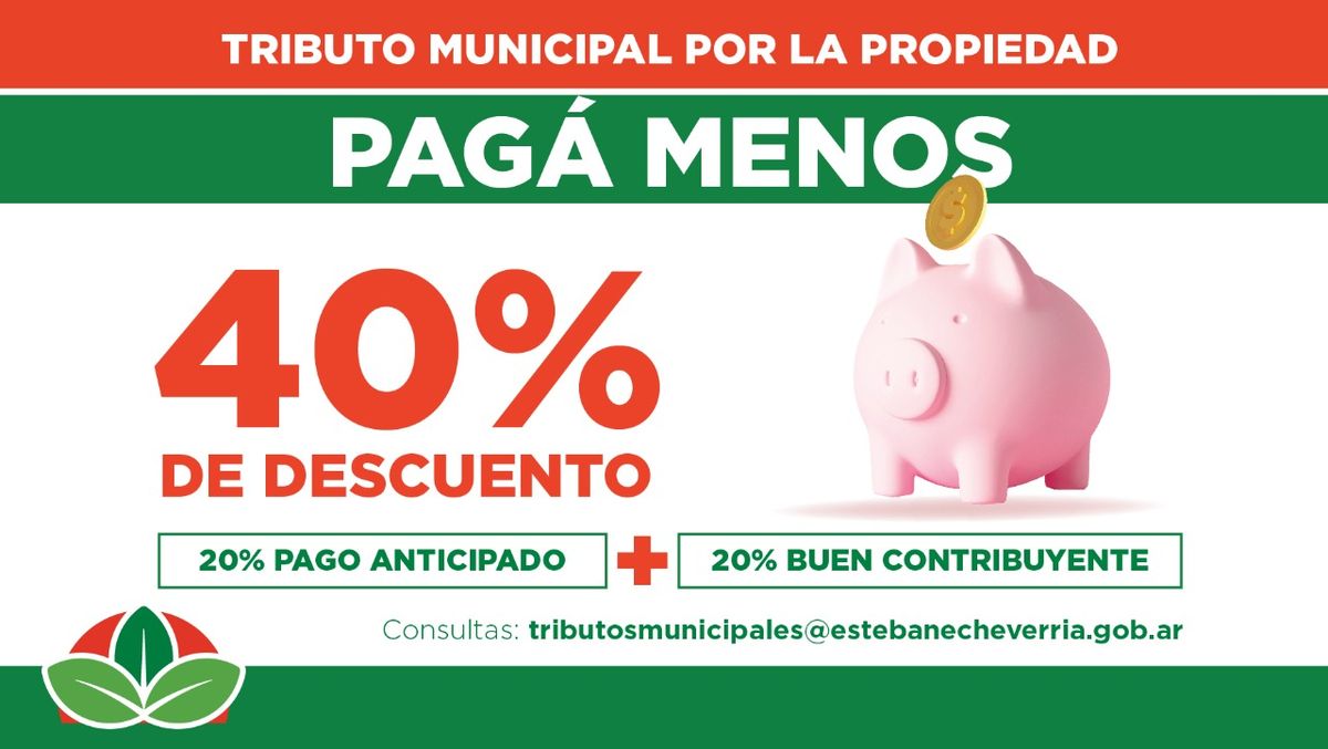 El Municipio de Esteban Echeverría brinda un importante beneficio que alcanza el 40% de descuento para las vecinas y los vecinos que efectúen por anticipado el pago anual del Tributo Municipal por la Propiedad y no tengan deuda al 31 de diciembre de 2022.