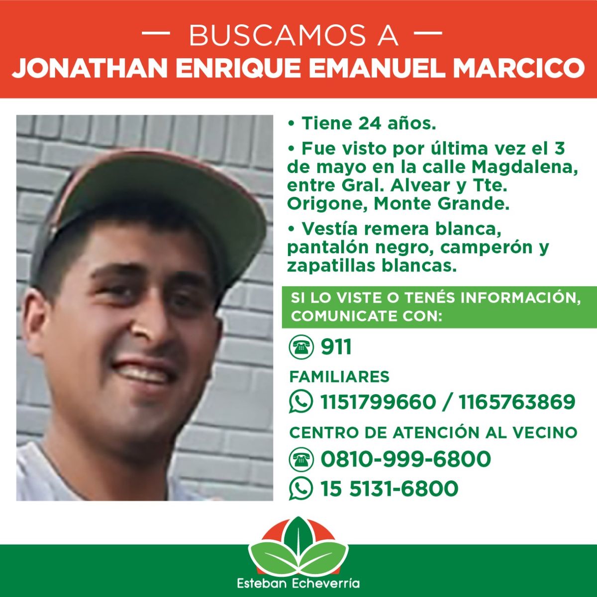 "Buscamos a Jonathan Enrique Emanuel Marcico. Fue visto por última vez el 3 de mayo en la calle Magdalena, entre Gral. Alvear y Tte. Origone, Monte Grande", detallaron las autoridades en un comunicado.