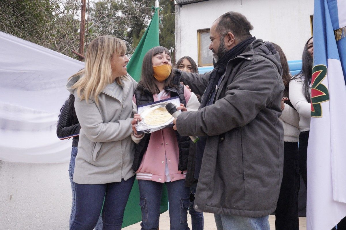 Durante la jornada, se descubrió una placa conmemorativa al evento y se otorgaron dos bandejas grabadas: una, para el director de la escuela y otra, para Kiara Ríos, la alumna de 1.° año que diseñó la bandera de la institución. A su vez, el Municipio hizo entrega de un subsidio con el que podrán adquirir material educativo para el establecimiento.