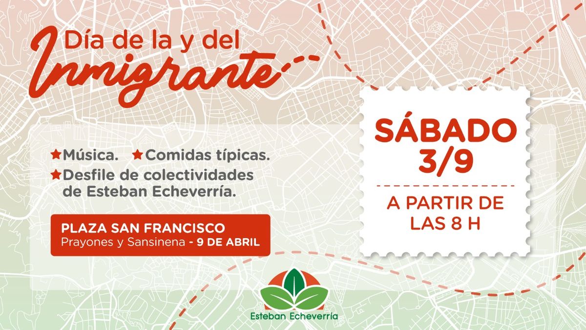 El sábado 3 de septiembre, desde las 8 horas, el Municipio de Esteban Echeverría celebrará el Día de la y del Inmigrante en la plaza San Francisco (Prayones y Sansinena, 9 de Abril). Durante los festejos, las vecinas y los vecinos podrán ver el desfile de colectividades y degustar platos típicos de distintas partes del mundo.