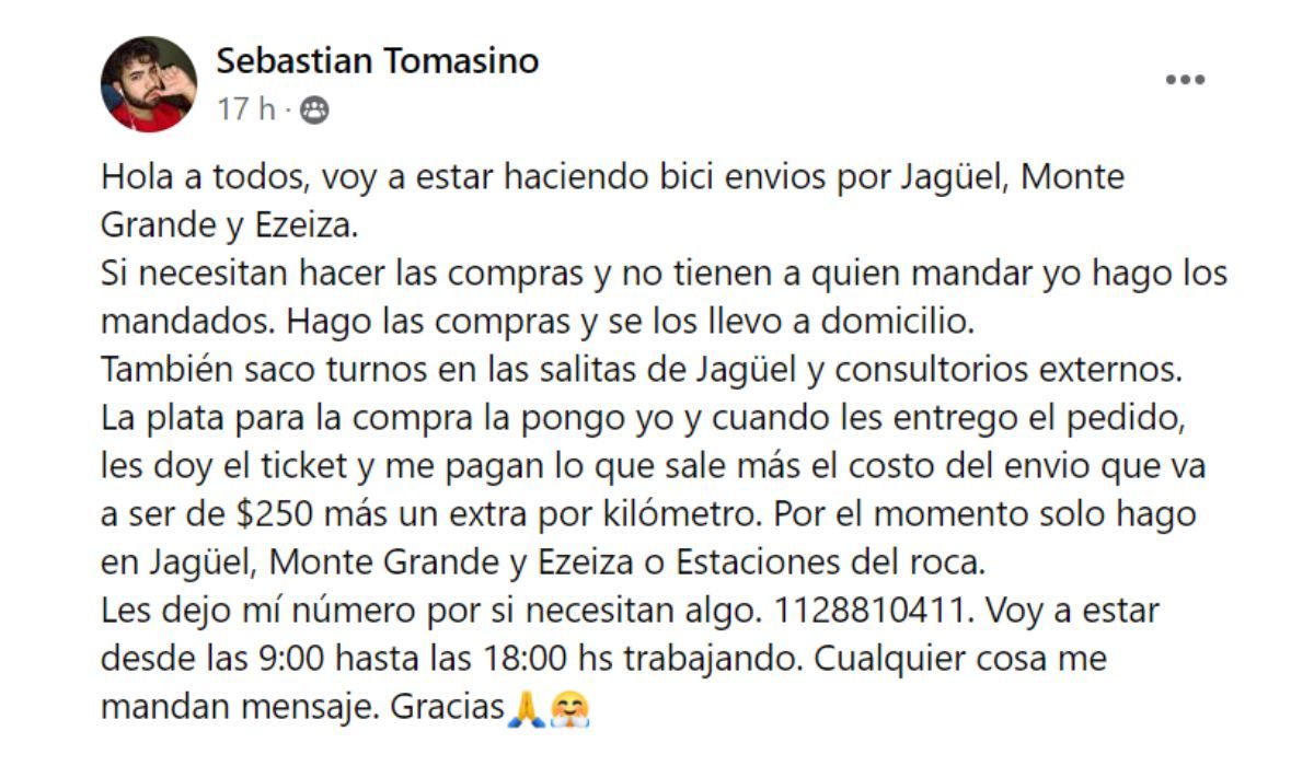 Sebastián Tomasino es de El Jagüel, Esteban Echeverría, tiene 21 años y, frente a la necesidad, decidió comenzar a hacer lo que él llama “bicienvíos”. “Hago las compras y las llevo a domicilio. También saco turnos en las salitas de El Jagüel y consultorios externos”, explicó en una publicación que compartió en grupos de Facebook de vecinos de la zona.