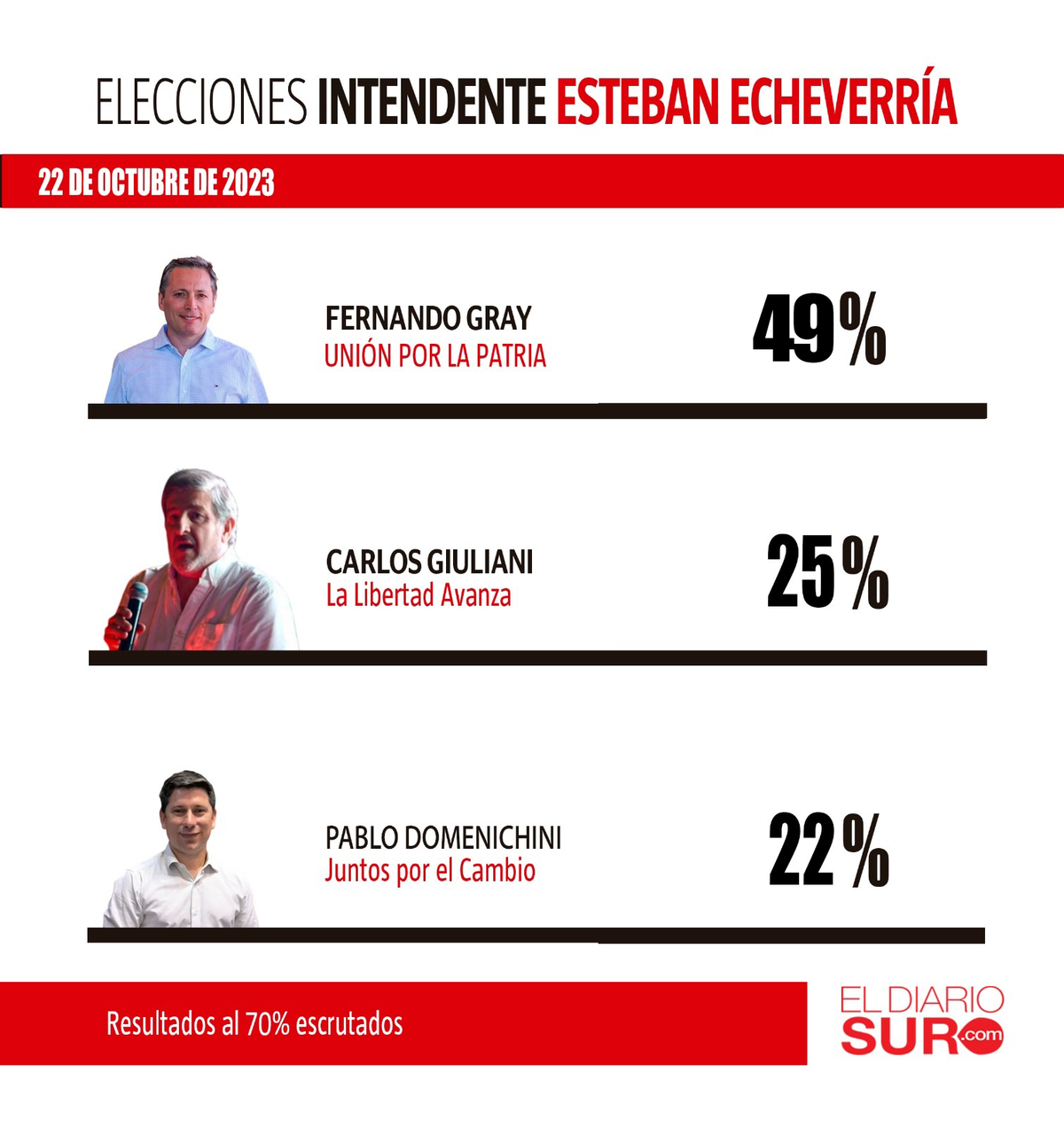 Esteban Echeverría eligió intendente este domingo 22 de octubre y decidió la continuidad de Fernando Gray por cuatro años más al frente del Municipio. El jefe comunal alcanzó el 49% de los votos frente a Carlos Giuliani, de La Libertad Avanza, con un 25,09% y a Pablo Domenichini, de Juntos por el Cambio, con un 22,12%.