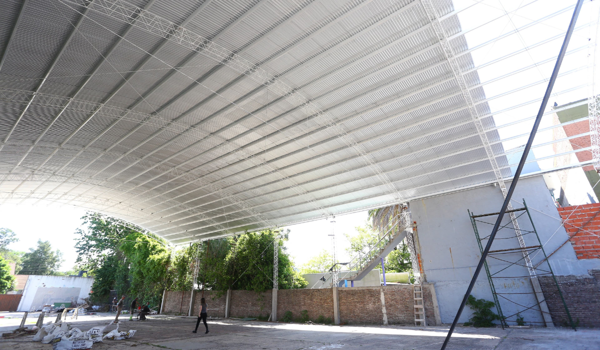 La obra consiste en el armado de un techo parabólico tradicional con cubierta de chapas cincalum sobre perfilería galvanizada y vigas reticuladas que tienen apoyo en bases y columnas de hormigón armado. A su vez, los trabajos contemplan la construcción de los desagües pluviales, la instalación eléctrica para la iluminación LED interior y la pintura del playón deportivo del patio.