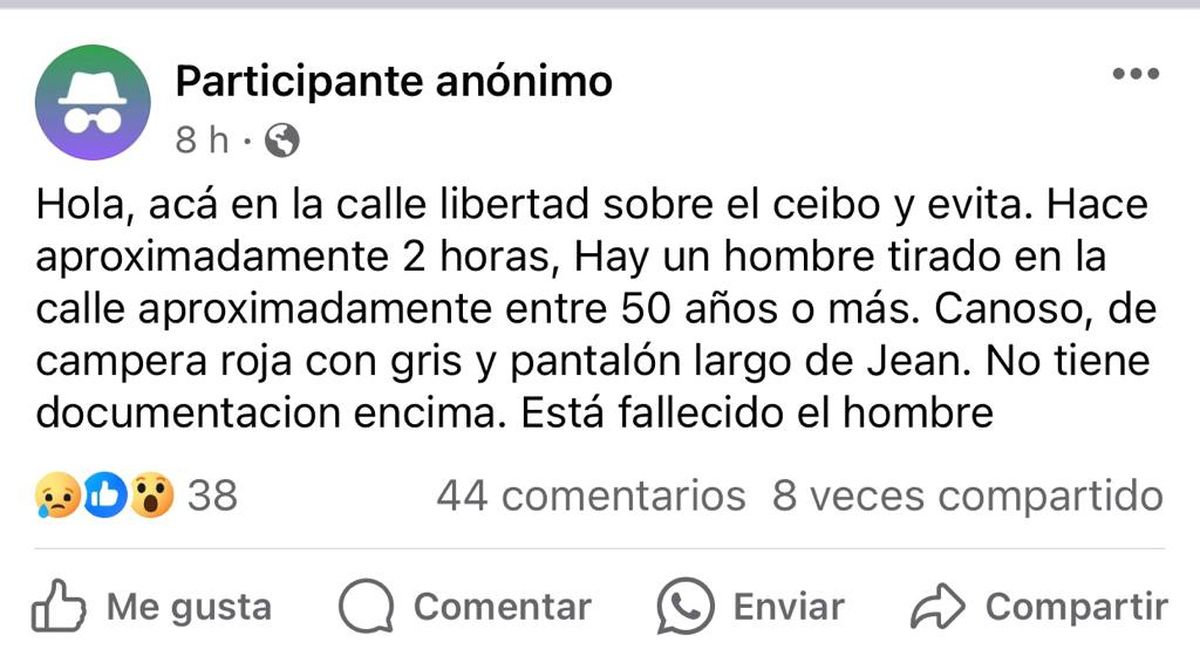 Este hombre de aproximadamente 60 años fue hallado en la calle Libertad, entre El Ceibo y Evita, en Monte Grande Sur, a metros del cementerio privado Manantial. "Hay un hombre tirado en la calle, aproximadamente entre 50 años o más. Canoso, de campera roja con gris y pantalón largo de jean. No tiene documentación encima. Está fallecido el hombre", publicó un participante anónimo en este grupo de Facebook alertando la situación.