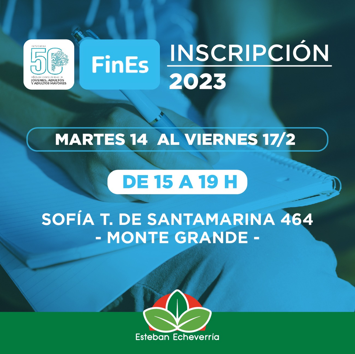 El Municipio de Esteban Echeverría anunció que a partir de hoy, martes 14 de febrero, se da inicio al proceso final para inscribirse al Plan FinEs 2023. Cabe destacar que es necesario haber realizado primero la preinscripción a través de la página web del Ministerio de Educación de la Nación.