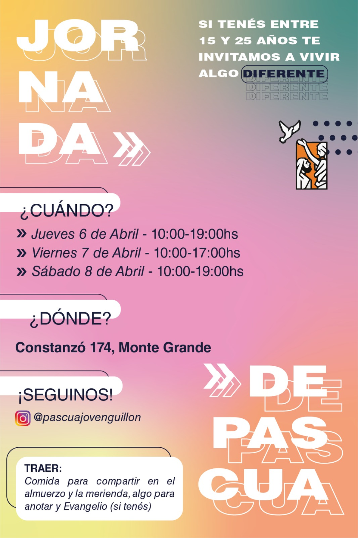 Se reunirán el jueves 6, viernes 7 y sábado 8 de abril en Constanzó 174, Monte Grande. Para más información, se puede ingresar al Instagram @pascuajovenguillon.