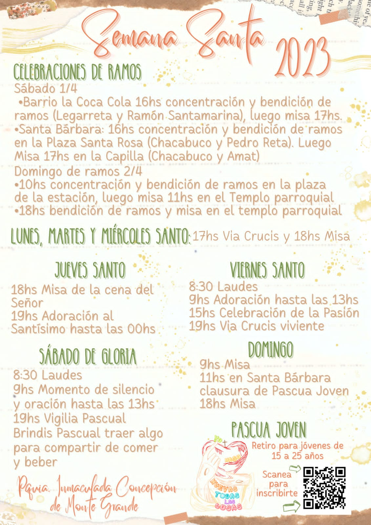 Por otro lado, la misma Parroquia ofrece un retiro de Pascua para jóvenes de entre 15 y 25 años, que se desarrollará durante jueves, viernes y sábado en la Capilla Santa Bárbara, ubicada entre las calles Amat y Chacabuco. Quienes quieran inscribirse, deberán entrar al formulario y completar los datos solicitados: https://docs.google.com/forms/d/e/1FAIpQLSep9AXU5bkUQig6hH2eQsk4Z0Xa5N8SD27K2aNLNLzMvlq4FA/viewform.