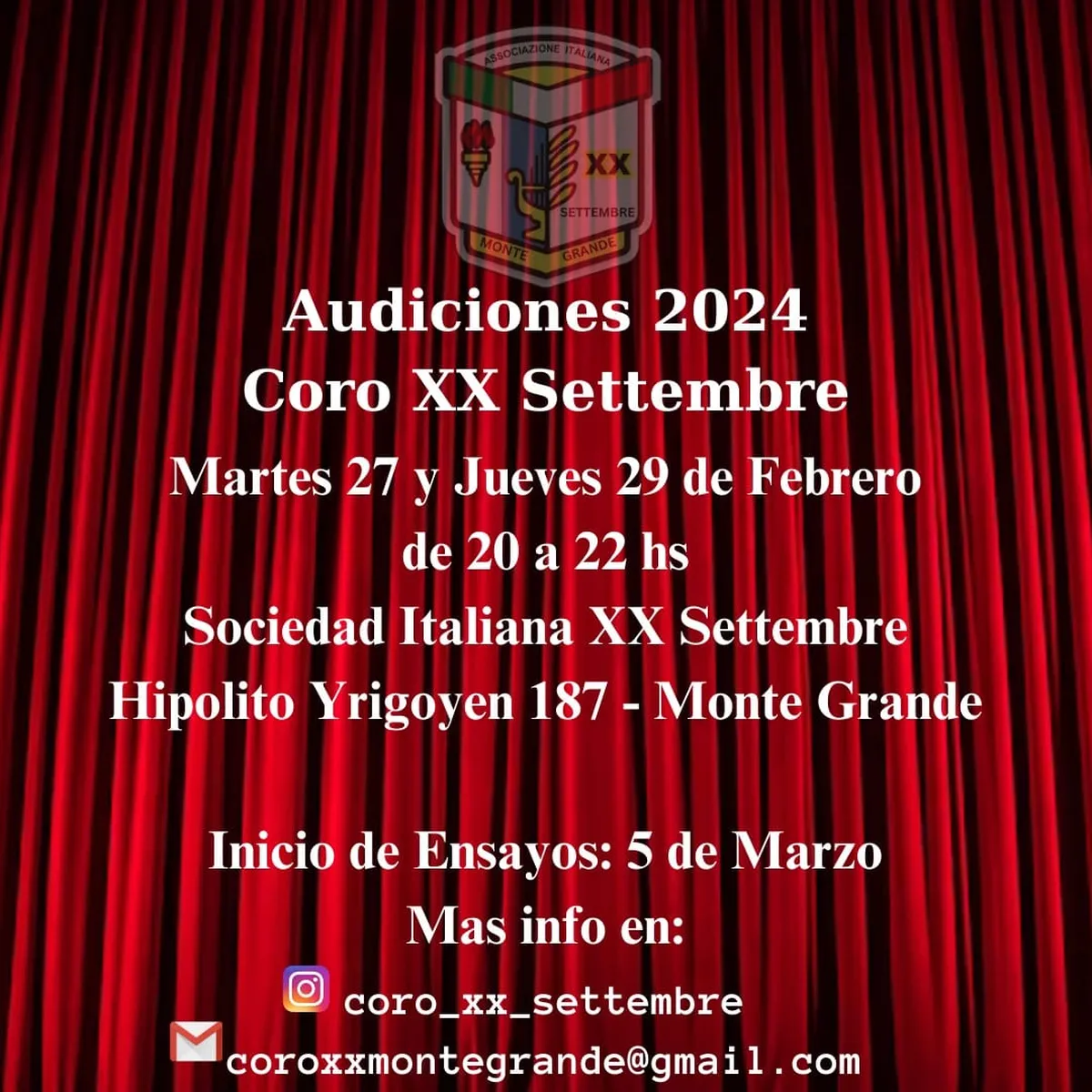 Las audiciones 2024 para el coro se realizarán el martes 27 jueves 29 de febrero de 20 a 22 horas en la Sociedad Italiana, ubicada en Hipólito Yrigoyen 187, Monte Grande. La gente se puede contactar a través de Instagram (@coro_xx_settembre).