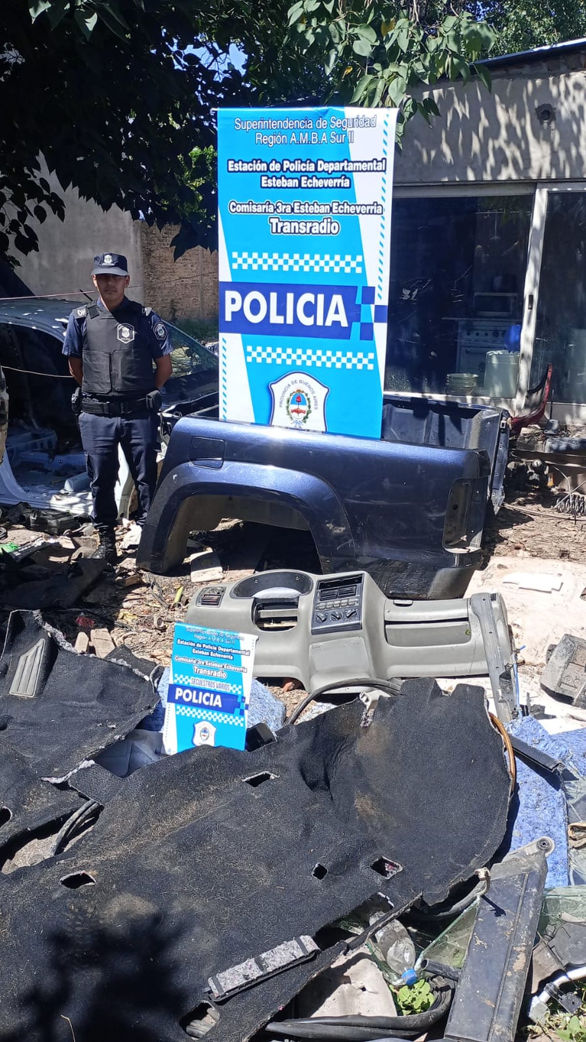Este lunes la Policía Bonaerense detuvo a un hombre de 37 años luego de allanar su propiedad, donde funcionaría un desarmadero, ubicado en la ciudad de Transradio, en el partido de Esteban Echeverría. Incautaron una camioneta con pedido de secuestro por robo, varias autopartes y patentes de otros vehículos robados.