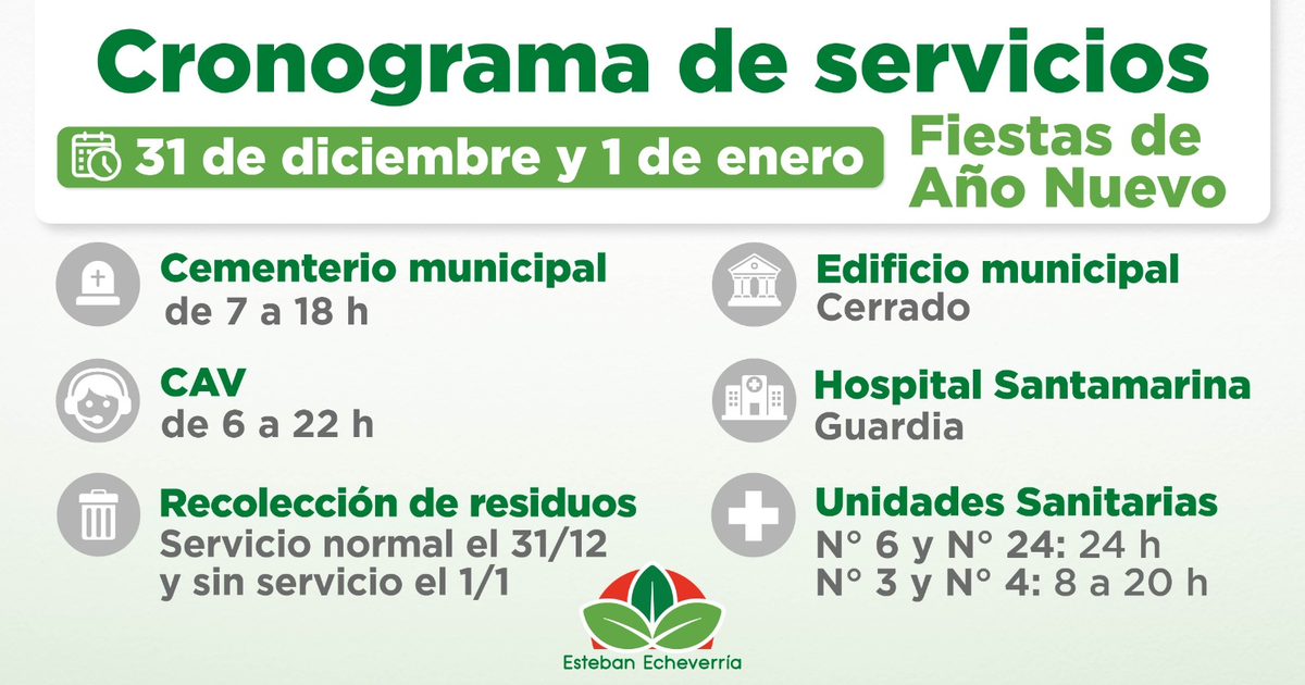 El Municipio de Esteban Echeverría informa el cronograma de servicios públicos durante el miércoles 31 de diciembre y jueves 1° de enero, con motivo de las fiestas de Año Nuevo.