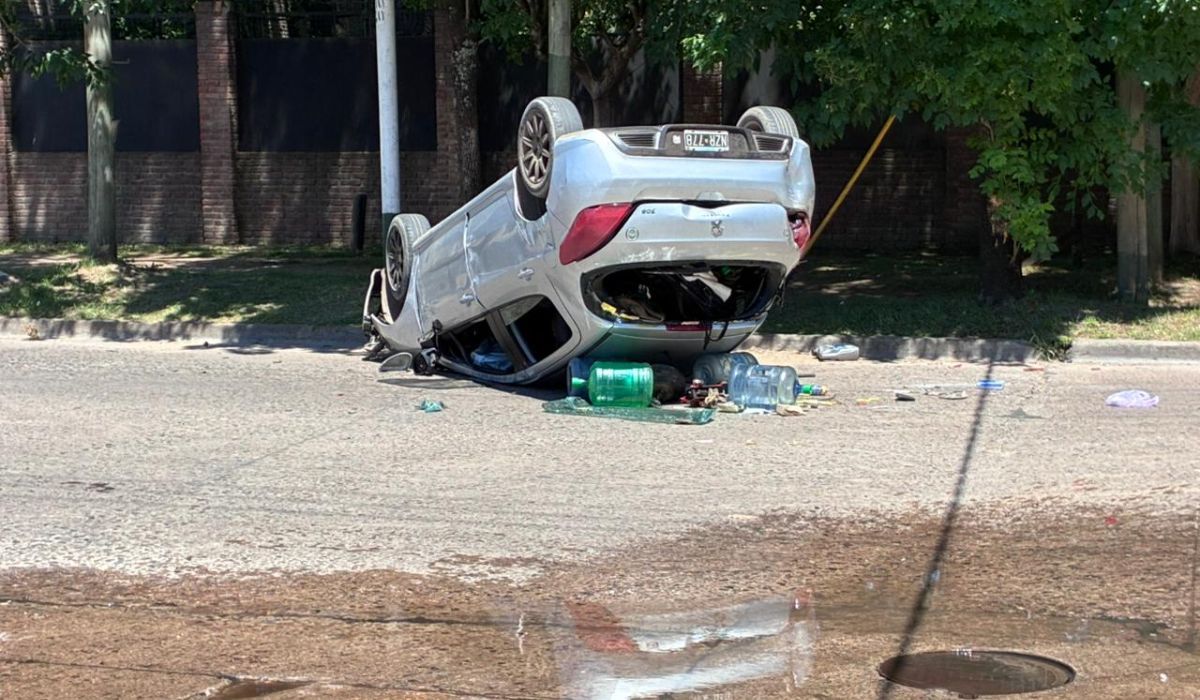 El accidente ocurrió alrededor de las 13:40 horas en la intersección de las calles Vicente López y Pedro Dreyer (La Colorada). En el choque, uno de los autos -que no se precisaron las causas- terminó volcado sobre la calzada con grandes daños materiales en la carrocería.