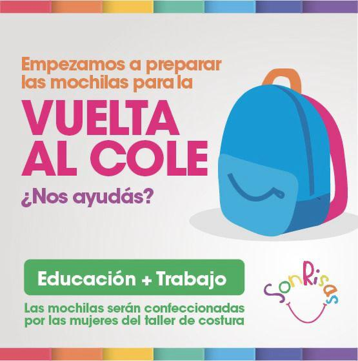 Además, cabe destacar que, según señaló el fundador de la institución, las mochilas se confeccionarán "con el trabajo de las costureras de Sonrisas".