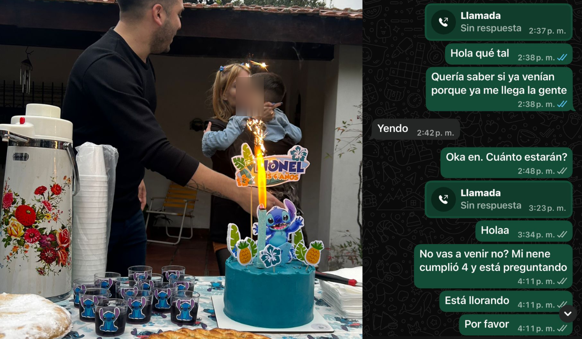 En ese sentido, continuó: "Me pidió la dirección de mi casa, lo cual ahora me preocupa mucho, y una seña, sí o sí. Nunca más me habló, así que ese mismo día le dije a qué hora iba a venir. Me dijo que iba a llegar 14:30 horas, cuando el cumpleaños empezaba a las 15. Me puso 'yendo' y nunca llegó, yo no sabía qué hacer con los nenes".