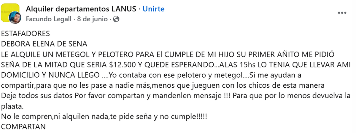 Este vecino, en este caso de Lanús, cuyo usuario de Facebook es Facundo Legall, explicó en la red social que alquiló un metegol y pelotero para el primer cumpleaños de su hijo: "Me pidió la seña de la mitad que sería $12.500 y quedé esperando... A las 15hs lo tenía que llegar a mi domicilio y nunca llegó". "Yo contaba con ese pelotero y metegol... Si me ayudan a compartir, para que no le pase a nadie más, menos que jueguen con los chicos de esta manera", escribió.