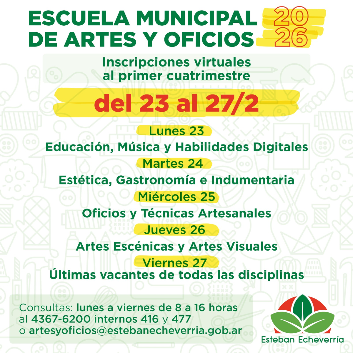 El Municipio de Esteban Echeverría anunció la apertura de las inscripciones para el primer cuatrimestre 2026 de la Escuela Municipal de Artes y Oficios, una propuesta de formación gratuita destinada a vecinas y vecinos del distrito.