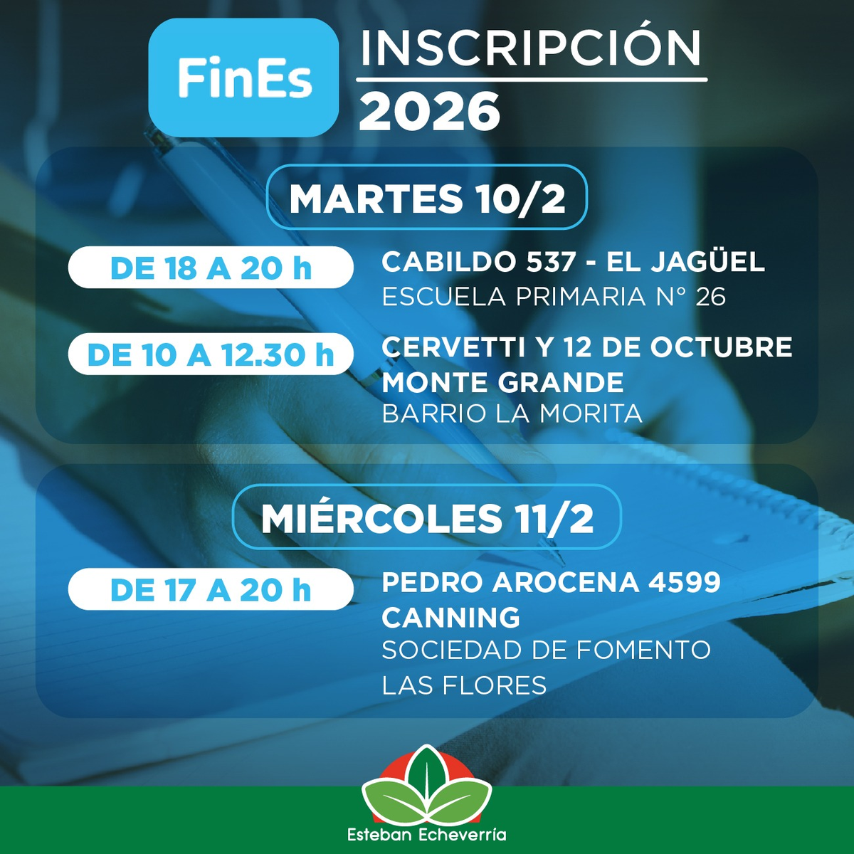El Municipio de Esteban Echeverría informó que este martes 10 de febrero comienza la inscripción para el Plan FinEs 2026, el programa destinado a jóvenes y adultos que deseen completar sus estudios.