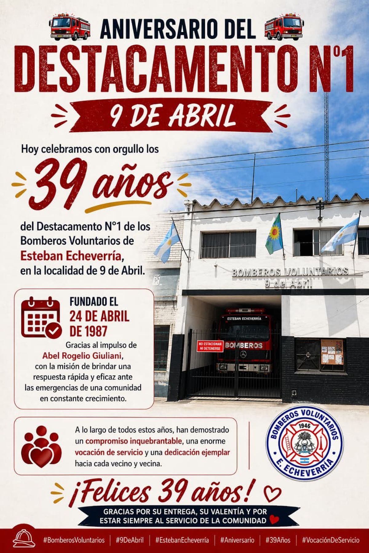 El destacamento de Bomberos Voluntarios de 9 de Abril cumple este viernes un nuevo aniversario desde su fundación en 1987. La creación respondió a la necesidad de brindar una respuesta más rápida a los vecinos de la localidad, en un contexto de crecimiento poblacional.