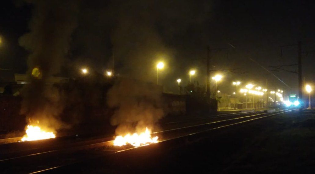 Dos formaciones se encuentran paradas a metros del paso bajo nivel de Cervetti a la espera de la intervención de los efectivos de policía o bomberos que apaguen las llamas que impiden que circulen por sobre las vías. Ambas formaciones poseen pasajeros a bordo.