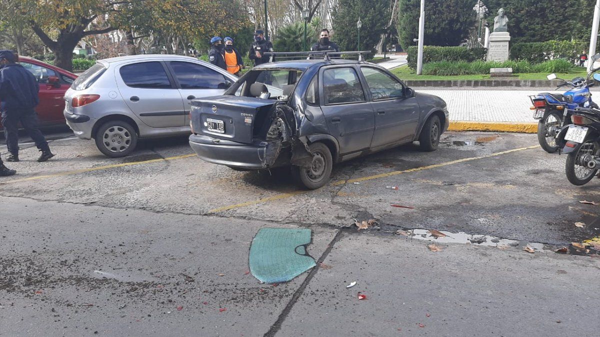 El choque tuvo tal virulencia que el Corsa terminó destrozado en la zona del baúl, se desprendió el parabrisas trasero y quedó subido a la vereda de la plaza, a centímetros del monumento a Bartolomé Mitre y los mástiles de las banderas.