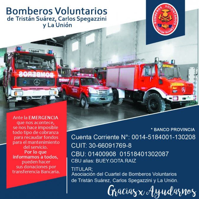 “Por ello buscamos tener algún ingreso con esta campaña que nos ayude a paliar los gastos fijos y los imprevistos de los dos cuarteles”, agregó Horacio, quien fuera 35 años Jefe del Cuerpo de Bomberos de dichas localidades.