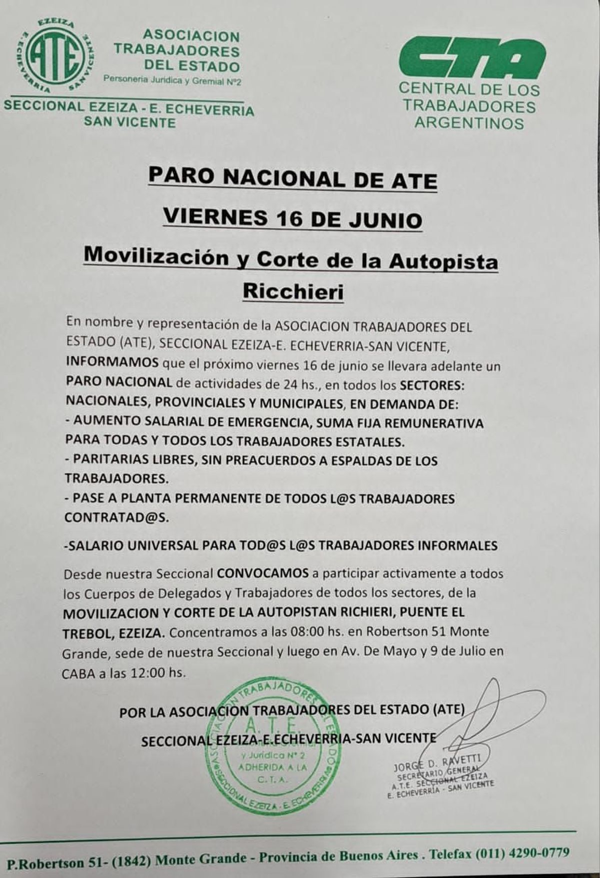 En el mismo documento se convocó a todos los cuerpos de delegados y trabajadores de participar activamente de la movilización y corte de la Autopista Ricchieri, puente El Trébol, Ezeiza, siendo la primera concentración a las 8:00 en la sede de la seccional ubicada en Robertson 51, Monte Grande y de allí movilizarse hasta el punto de la autopista.