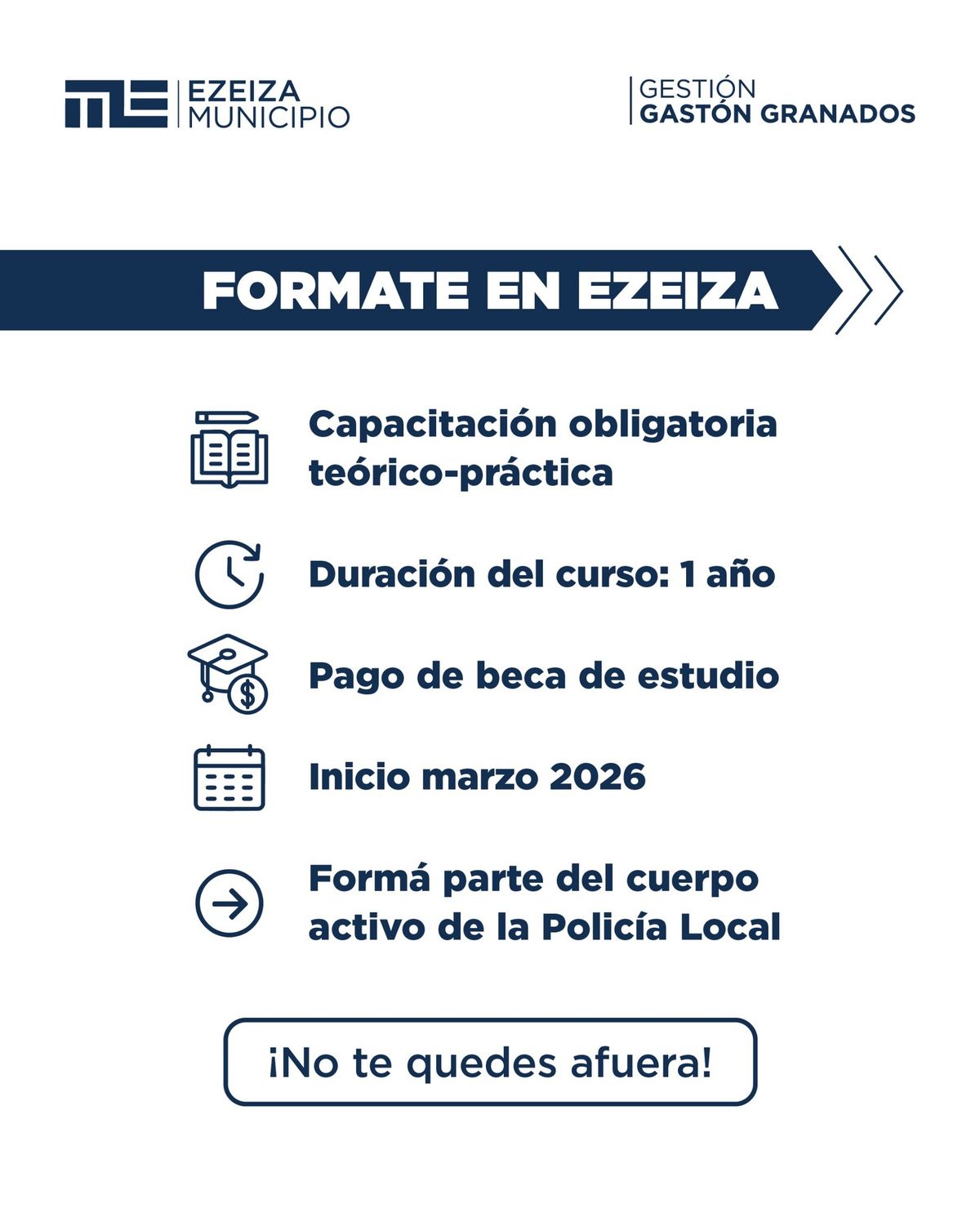 La Municipalidad de Ezeiza anunció la apertura de la convocatoria 2026 para la conformación de la nueva Policía Municipal Ezeiza ALFA. El llamado está dirigido a hombres y mujeres del distrito que deseen integrar el nuevo cuerpo de seguridad local, en el marco del plan municipal denominado Tolerancia Cero al Delito II.