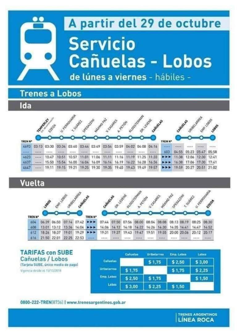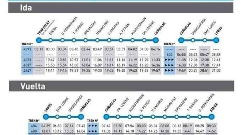 Los trenes partirán desde Cañuelas a las 4:55, 11:38, 16:38 y 19:59, mientras que los servicios desde Ezeiza serán los que salgan a las 10:47, 15:50 y 19:11. El retorno desde Lobos a Ezeiza será a las 6:39, 13:01 y 18:26, mientras que el último servicio que parte desde Lobos a las 21:50 llegará sólo a Cañuelas.