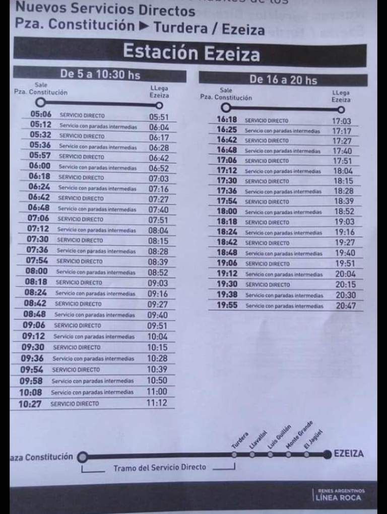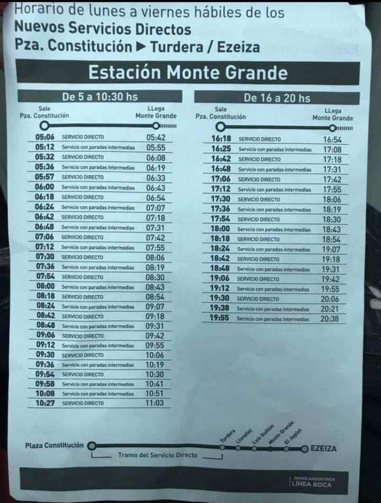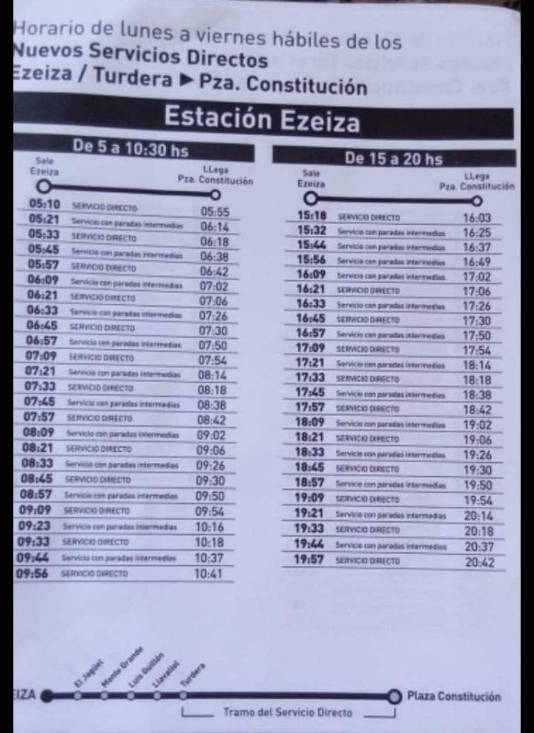 Los trenes directos partirán desde y hacia Ezeiza vía Temperley realizando paradas en Turdera, Llavallol, Luis Guillón, Monte Grande y El Jagüel; mientras que también habrá un servicio extra parando en todas Hipólito Yrigoyen, Darío Santillán y Maximiliano Kosteki, Gerli, Lanús, Escalada, Banfield, Lomas de Zamora y Temperley, además de las ya mencionadas-.