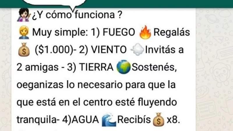 La estafa sucede a medida de que se extiende la red. En un principio participan 15 personas, ocho aportan plata y uno solo la cobra. Así quedan 14 que se dividen en dos grupos de 7, que deben buscar a ocho nuevos aportantes para que dos aguas, una de cada grupo, cobren el monto prometido, así sucesivamente.