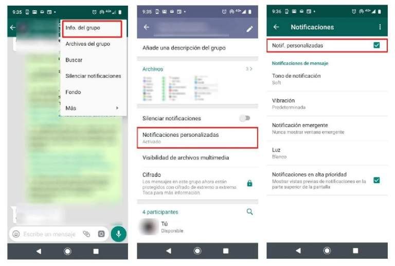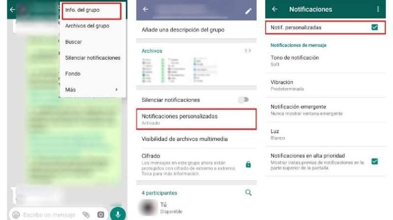 Dentro de alguno de los grupos, al tocar los tres puntos que están arriba a la derecha hay que buscar Info. del Grupo y después Notificaciones personalizadas. El siguiente paso es tildar la opción que aparece al tope; entonces se puede escoger un tono específico y determinar otras variables, como la vibración o el tipo de notificación.